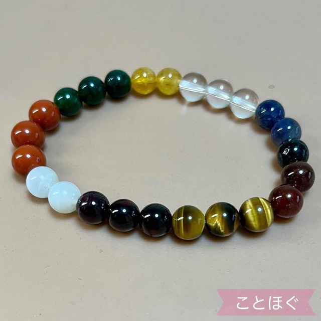 ナヴァラトナとは、九つの宝石を厳密に配置した護符です。 九つの惑星より放たれる宇宙光線は、 私たちの意思・思考・性格に影響すると言われています。 これにより運命のパターン、体質、気質ができます。 ナヴァラトナは、 九つの惑星からの悪い影響をカットし 常に必要な力を受け取り、開運をもたらします。 ☆ブレスレット 太陽:赤色系のガーネット 月:ムーンストーン 火星:レッドジャスパー 水星:グリーン・アベンチュリン・クォーツ 木星:天然シトリン(またはゴールデンベリル、イエローベリル) 金星:無色透明水晶 土星:アイオライト ラーフ:ヘソナイトガーネット ケートゥ:タイガーアイ ※石の市場価格の変動により、 対応するパワーストーンの種類が変わることがあります。 ※クッションカバーに入れてお送りします。 カバーの形状、デザインは変わることがあります。 ◆ことほぐ発送のご案内◆ 毎月研修のため、発送をお休みをさせて頂く日程があります。 お急ぎの方はブログのお知らせをご確認ください。 https://kotohogu.thebase.in/blog